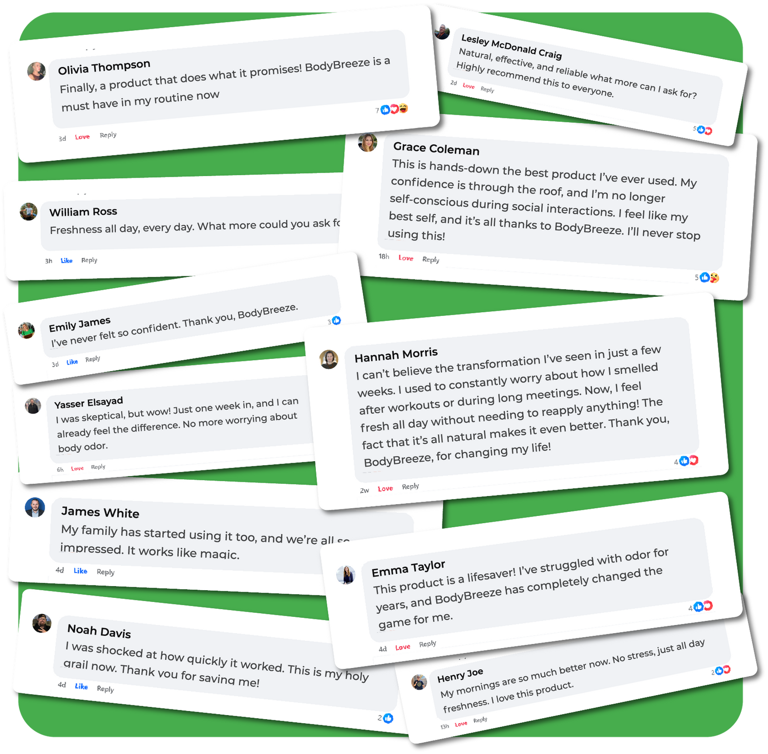 I’ve never felt so fresh and confident! My breath, skin, and gut health have improved dramatically. No more bloating, and I love the all-day odor elimination. Highly recommend BodyBreeze!
